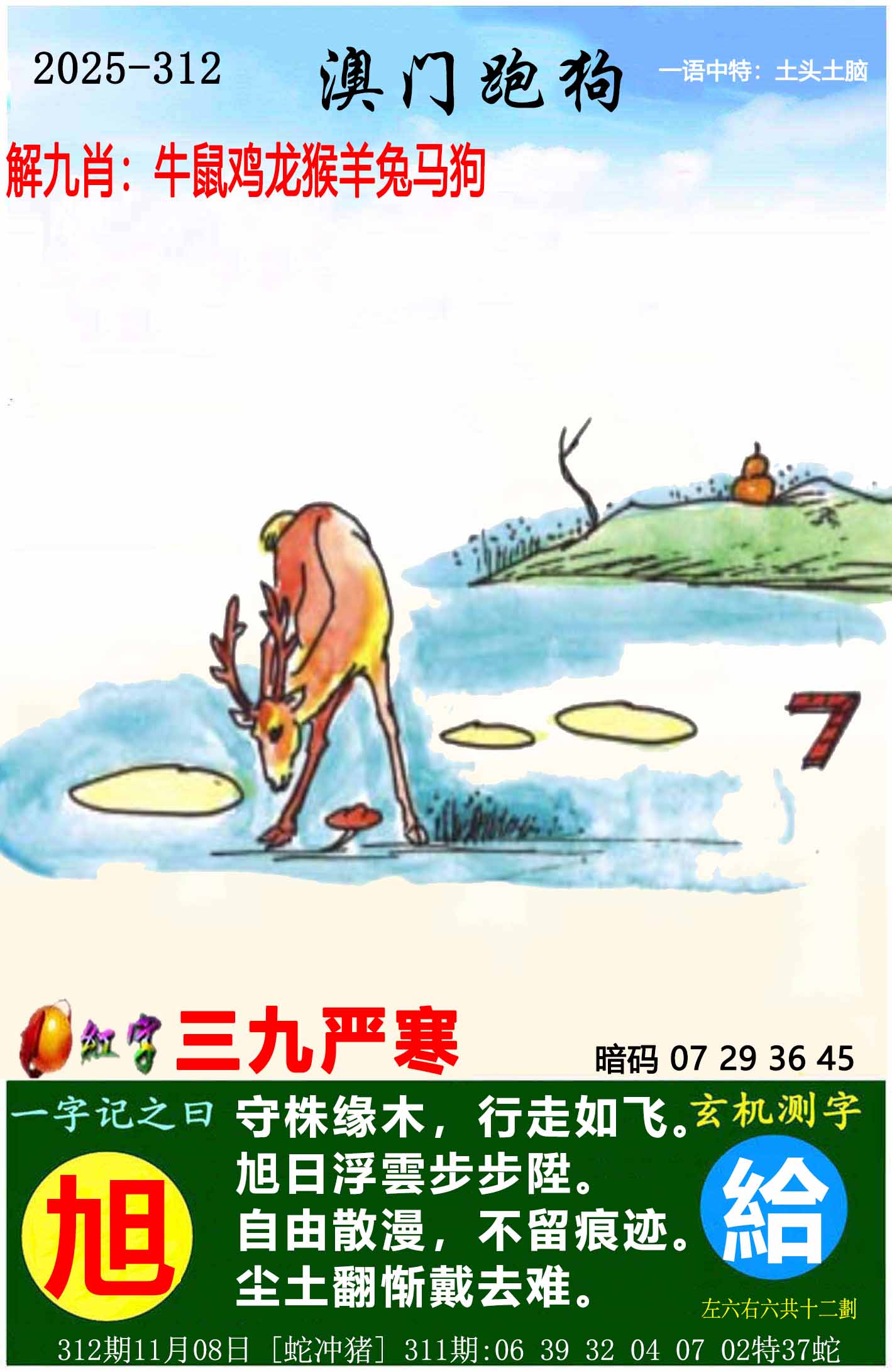 312期:⑦肖 | 牛马猴鼠蛇兔龙 | 开:?00中 |