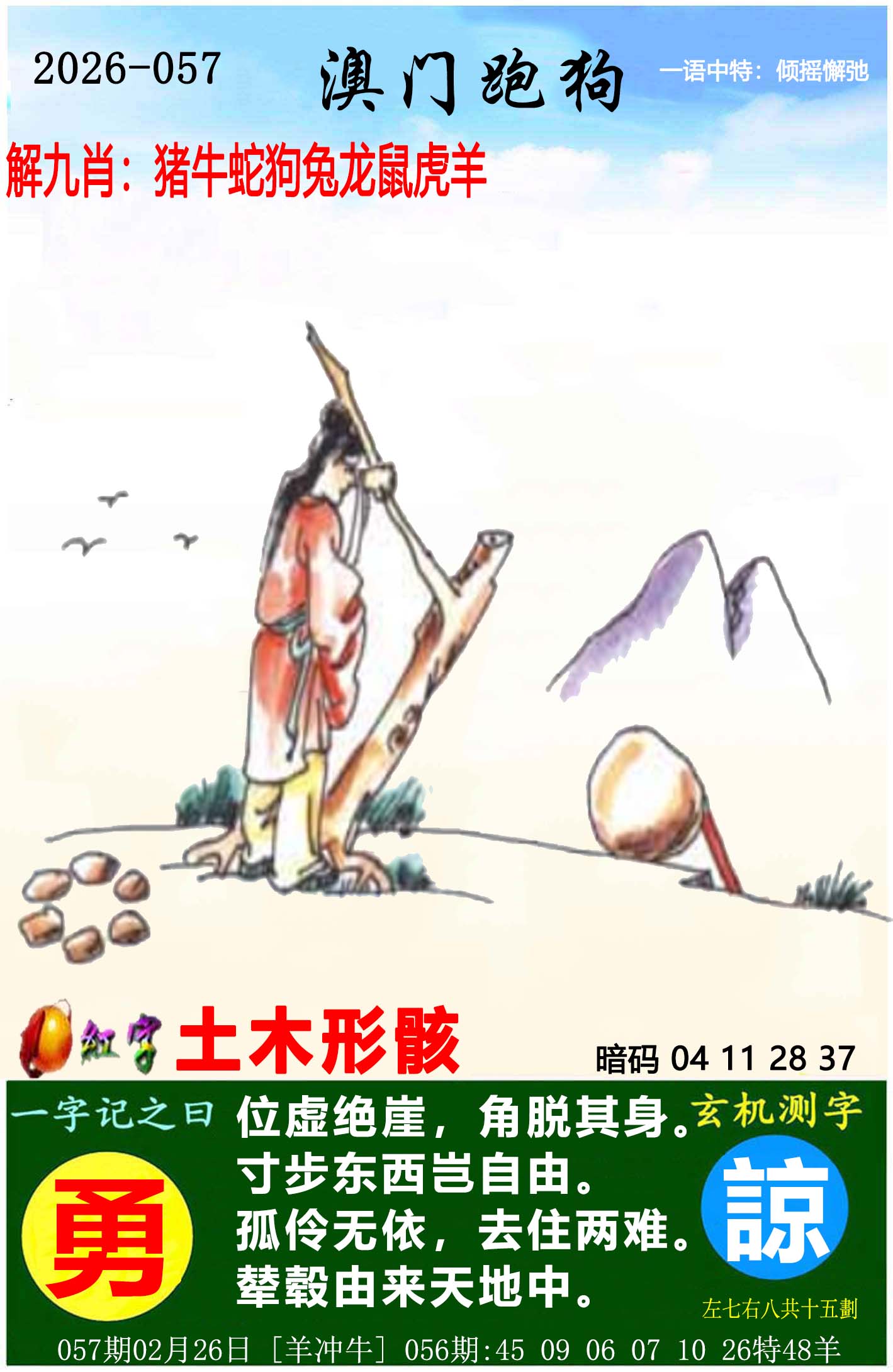 057期:⑤肖 | 鸡狗马猪虎 | 开:?00中 |